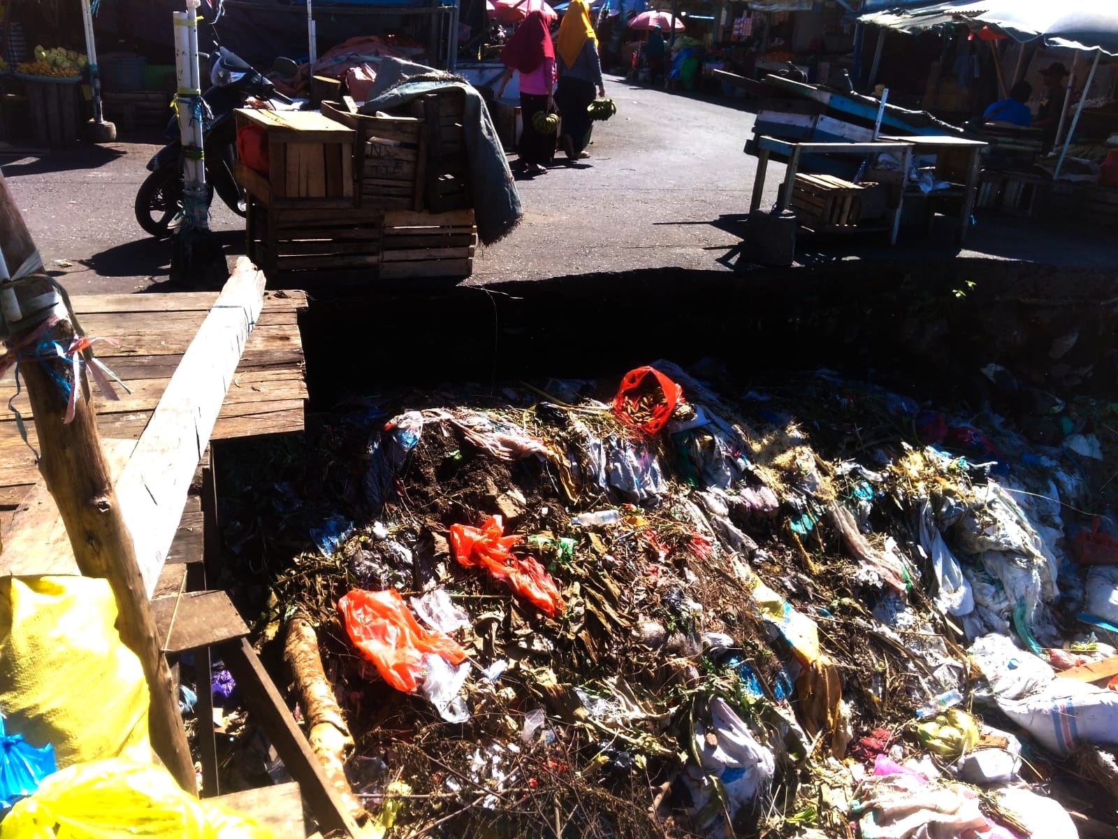 Salah satu ruas jalan di area belakang pasar tersebut, longsor akibat abrasi. Olehnya itu, sejumlah pedagang memanfaatkan area itu sebagai tempat sampah.
