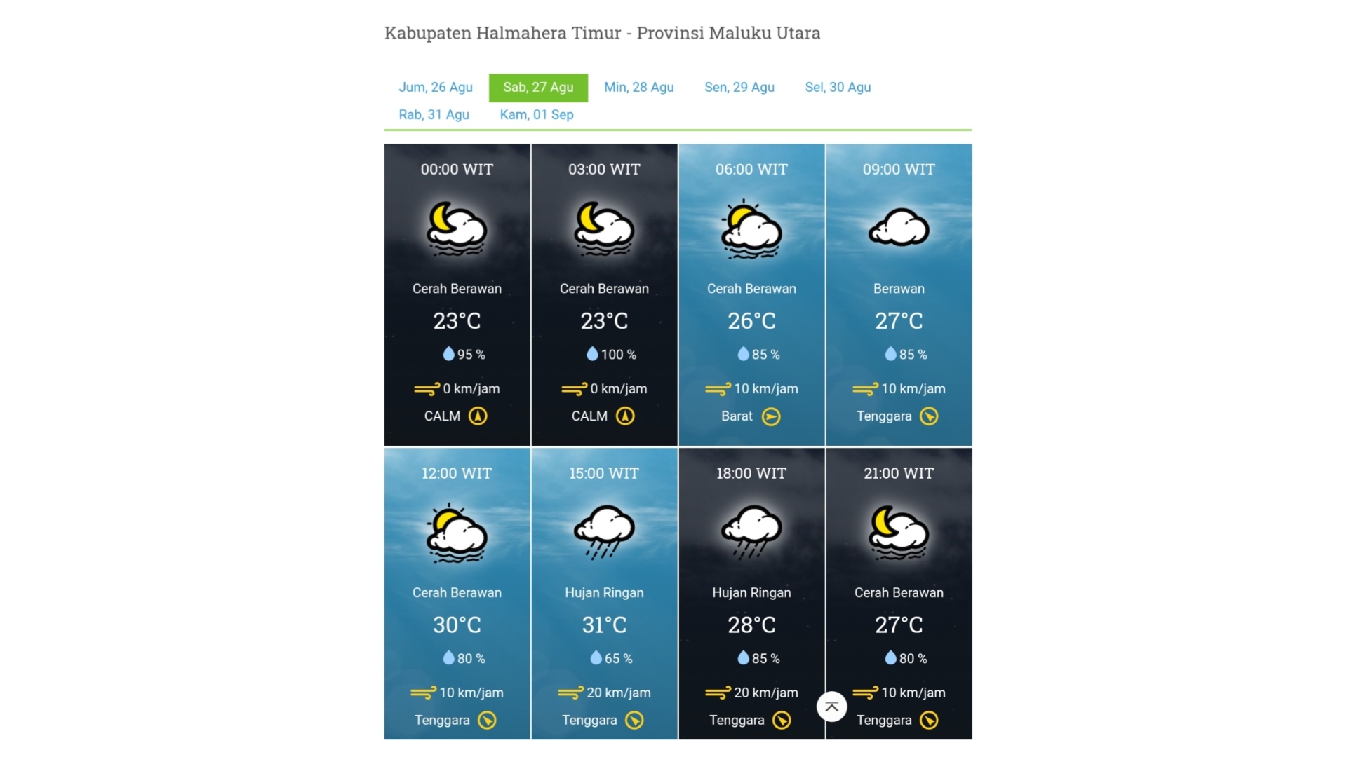 TRIBUNTERNATE.COM - Berikut adalah prakiraan cuaca untuk Kabupaten Halmahera Timur, Maluku Utara untuk besok Sabtu, 27 Agustus 2022.