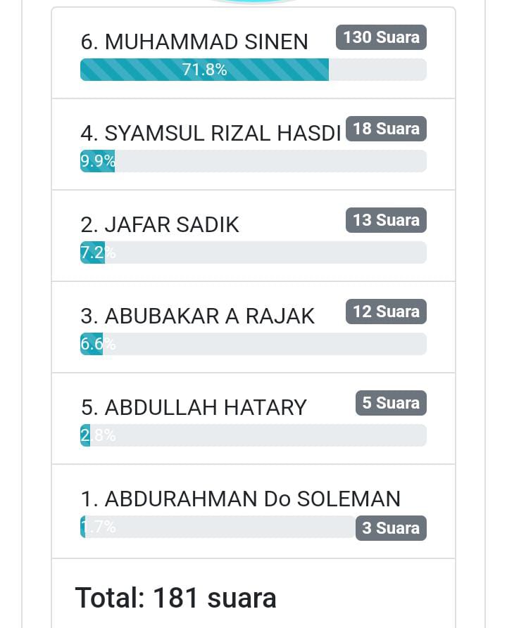 Nama Muhammad Sinen meraih dukungan sebanyak 71.8 persen. atau 130 suara.