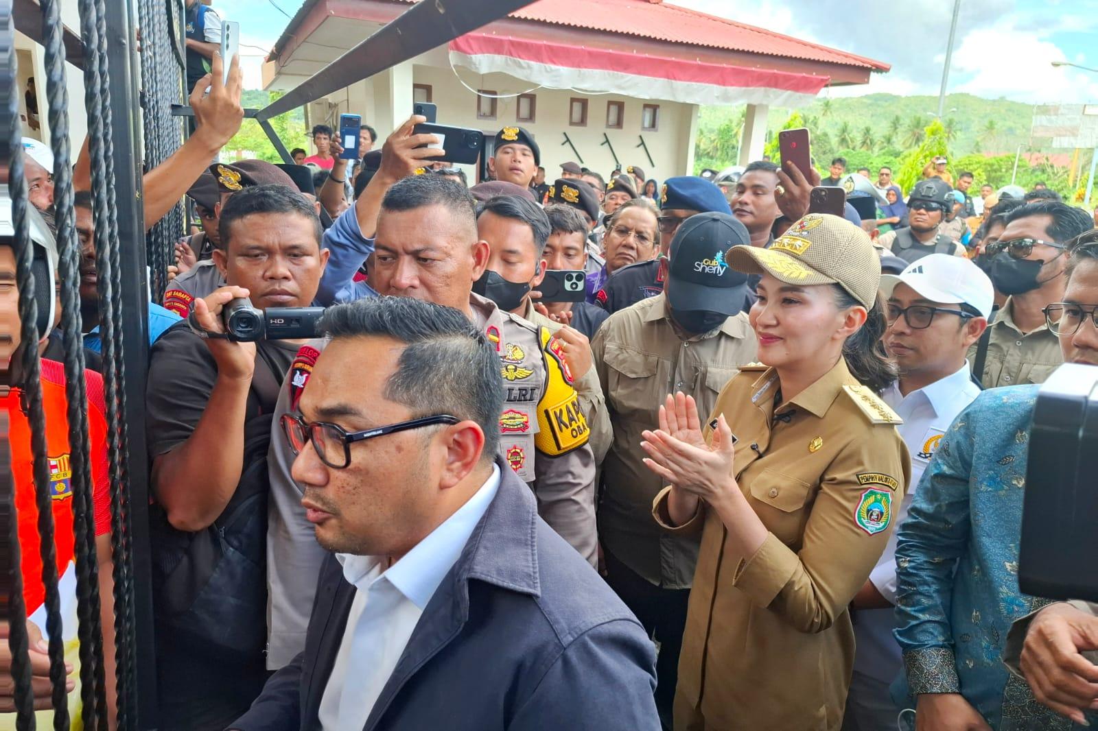 Tak lama kemudian Sherly Laos muncul di tengah kerumunan di gerbang kantor DPRD.