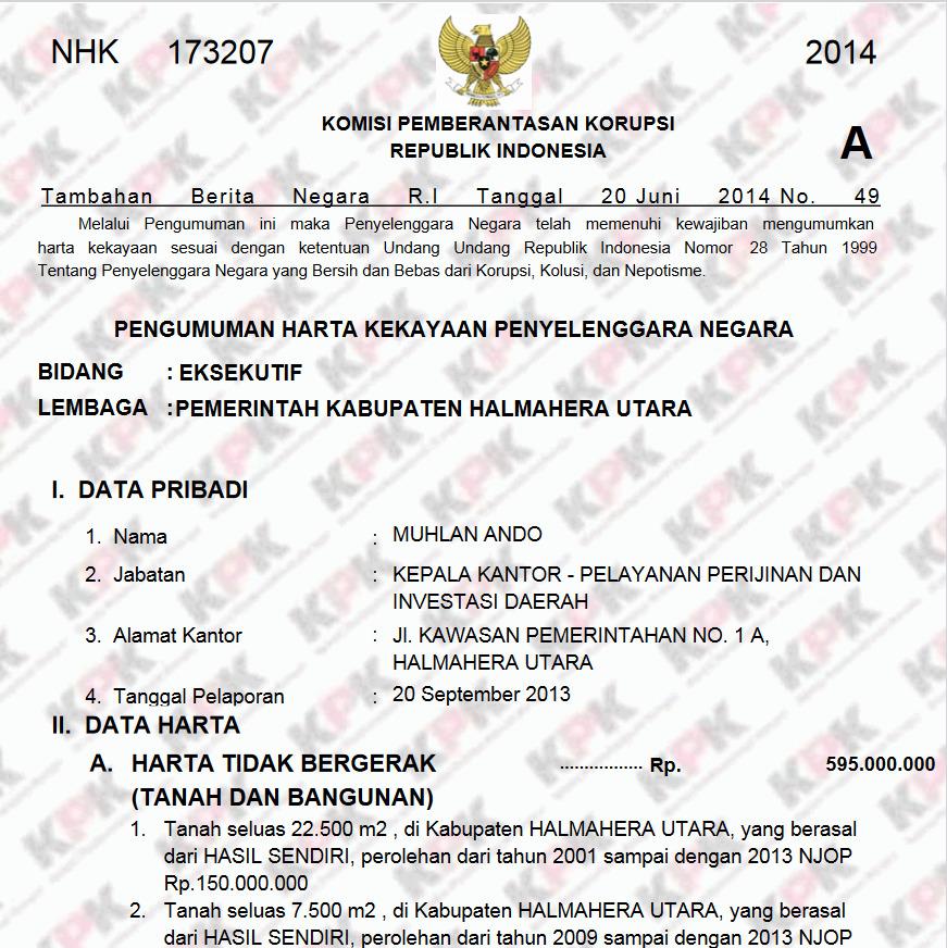 Kepala Dinas (Kadis) Pemuda dan Olahraga Halmahera Utara, Maluku Utara, Muhlan Ando, memiliki harta kekayaan mencapai Rp1.031.136.958